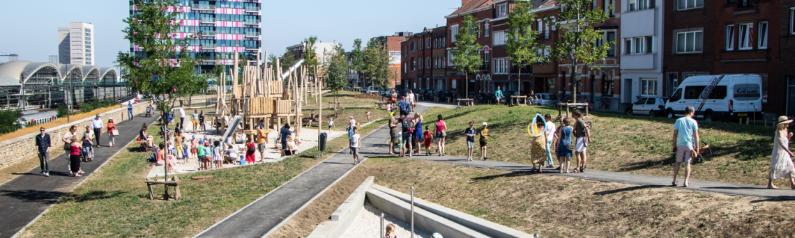 Entre la vía del tren y la avenida Martelarenlaan en Kessel-Lo encontrarás un largo parque verde con zonas de césped, árboles y plantas, parques infantiles y 2 plazoletas de barrio.